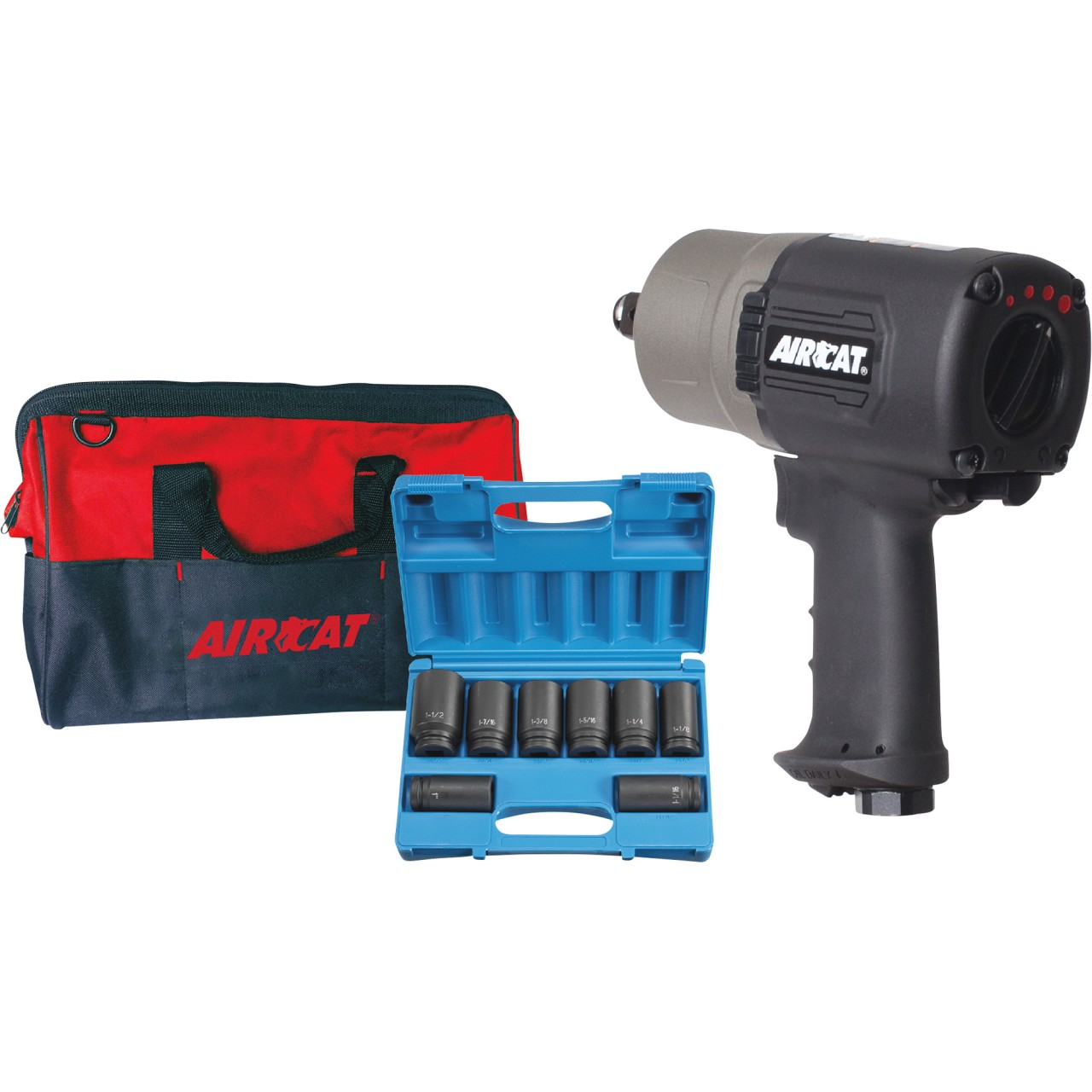 The Aircat 3/4in. Super Duty Impact Wrench is built with a hard-hitting twin hammer mechanism that produces up to 1400 ft.-lbs. of maximum torque for extra heavy-duty applications. A combined forward/reverse and power management switch provides ultimate control and easy one-handed operation. Titanium-finish hammer case and built-in side impact buffers protect wrench from tough working conditions. Patented silencing technology reduces the noise level to 86dB. Ergonomic grip is designed to perfectly fit the hand, providing unmatched comfort for the user. The 1700-XLK is designed for heavy-duty fleet maintenance and industrial MRO work. Kit includes 8-pc. 3/4in.-drive deep impact socket set and Aircat tool bag.