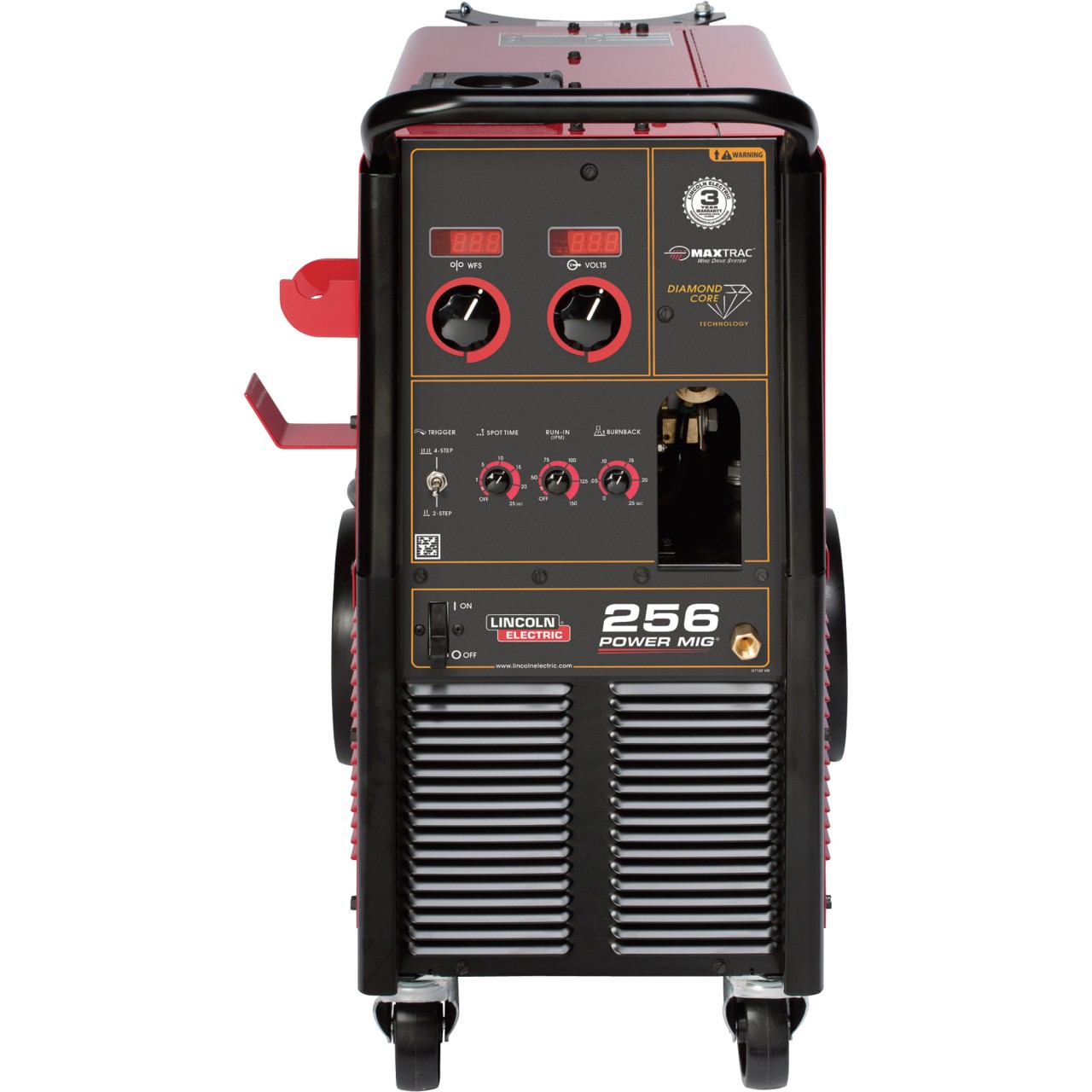 The Lincoln Electric Power MIG 256 Flux-Cored/MIG Welder with Cart is a 300 Amp MIG and flux-cored welder designed for light industrial job shop fabrication, maintenance or repair work. Diamond Core Technology™ delivers a forgiving arc, excellent out-of-position arc stability, low spatter and a wide voltage sweet spot at a given wire feed speed for great results with steel, stainless steel or aluminum welding.