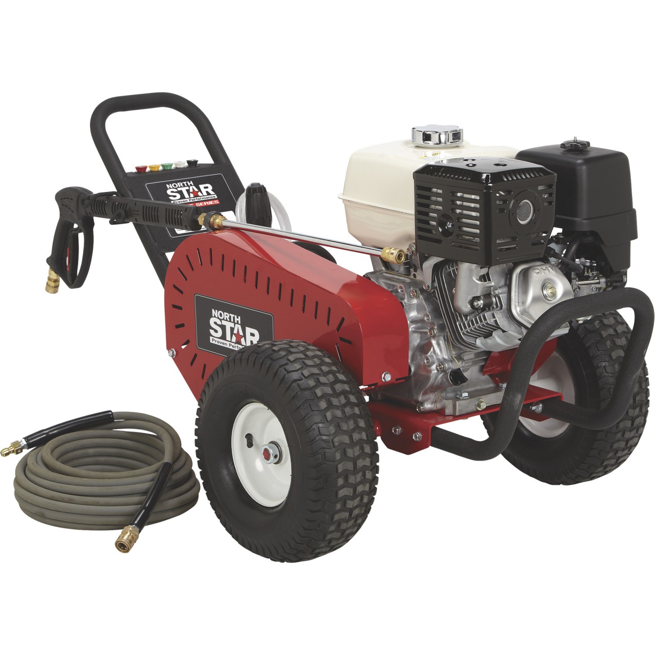 Loading... Please wait...This NorthStar Super High Flow Gas Cold Water Pressure Washer is ideal when big jobs and tight schedules require the ultimate speed. Exclusive NorthStar Super High Flow technology delivers unrivaled cleaning power, blasting through the toughest mud, dirt and debris. The quiet, reliable Honda GX390 389cc OHV engine features a cast iron sleeve, and a horizontal shaft design for up to five times longer life than vertical shaft engines. The industrial-grade NorthStar SHF Series belt drive triplex pump runs cooler and minimizes vibration for less pump fatigue and a longer life, plus features renowned Parker-Praedifa seals to offer the ultimate in durability.
